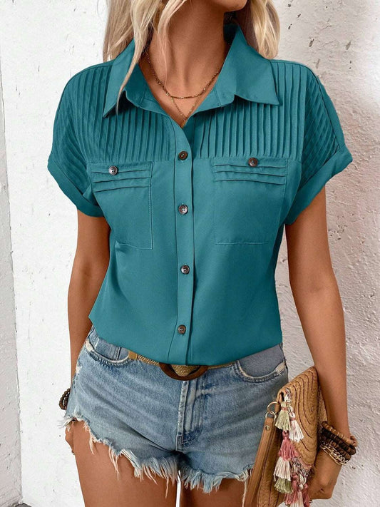 Pleated Detail Collared Neck Short Sleeve Shirt